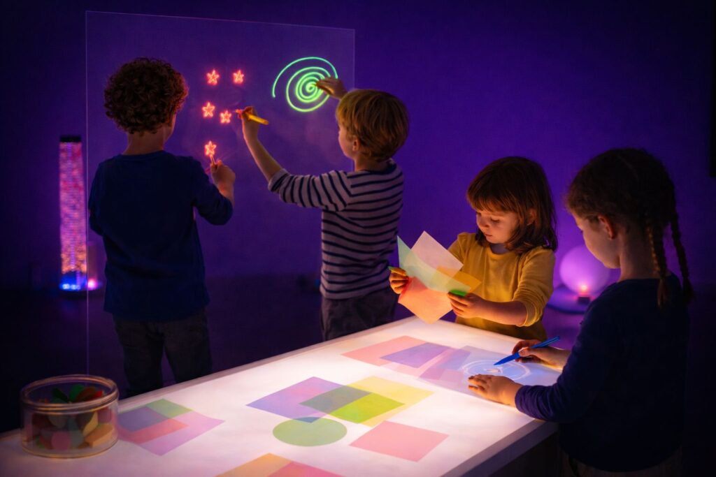 Dans un espace tamisé, les enfants explorent le dessin autrement : supports lumineux, calques colorés et jeux de transparence. Au contact de la lumière, les formes apparaissent, se superposent, se déplacent et se transforment au fil des gestes.